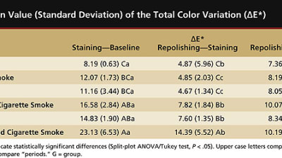 Online Only Online Only Cigarette Smoke Combined with Staining Beverages Decrease Luminosity and Increase Pigmentation in Composite Resin Restorations By Céres Mendonça Fontes, DDS, Getullo da Rocha Nogueira-Fllho, DDS, Max José Pimenta Lima, DDS, Paula Mathias, DDS, Thais Aranha Rossi, DDS August 01, 2010 15 min read