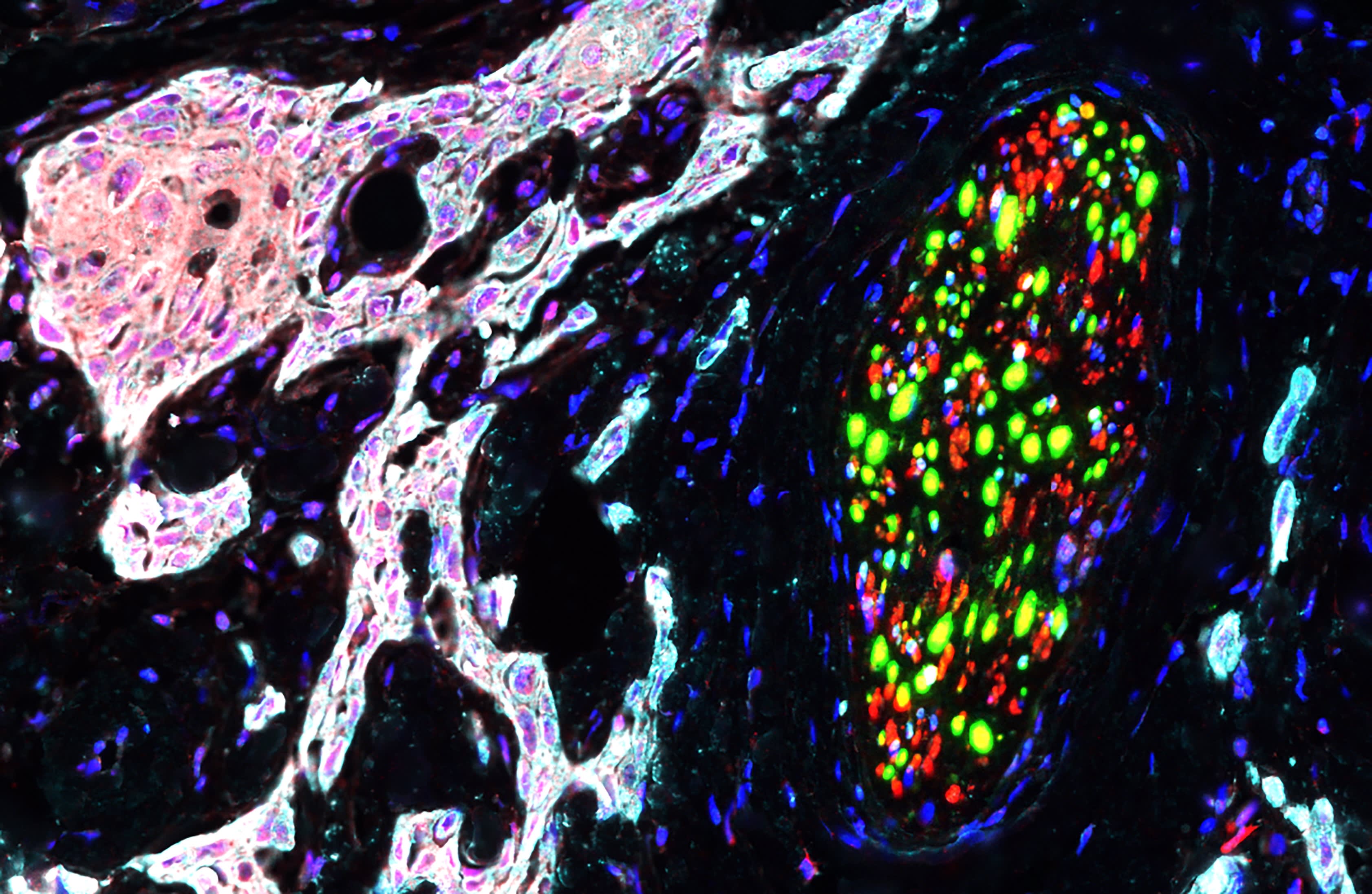 In the Science Signaling study (https://www.science.org/doi/10.1126/scisignal.adt3026), researchers from NYU Dentistry, The University of Texas MD Anderson Cancer Center, and Loma Linda University School of Dentistry examined human oral cancer tissue samples and mouse models. They found that cancer cells and nearby glial cells secreted EGFR ligands, which activated EGFR in surrounding nerves.