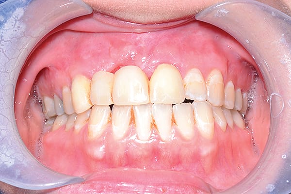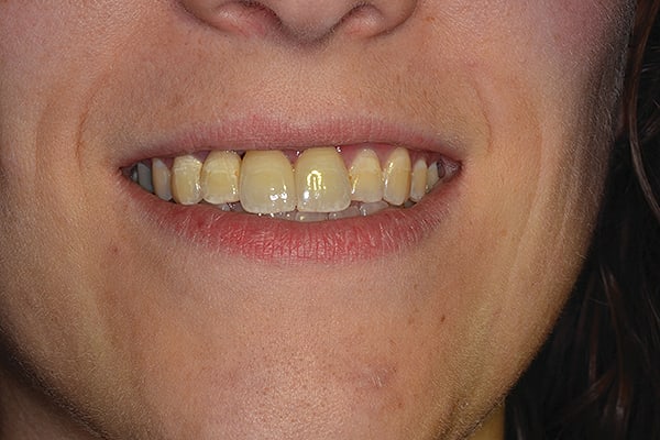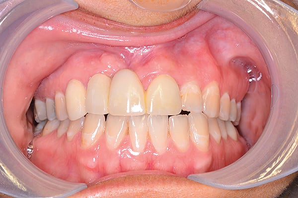 Figure 8 Esthetic re-evaluation with an ideal fixed temporary provisional. Significant soft tissue defects were noticed. (Fig 8 and Fig 9 courtesy of William Heggerick, DDS, prosthodontist, and Yuki Momma, RDT, Weston, Massachusetts)