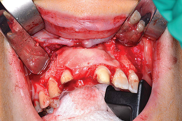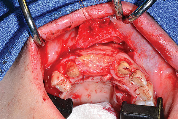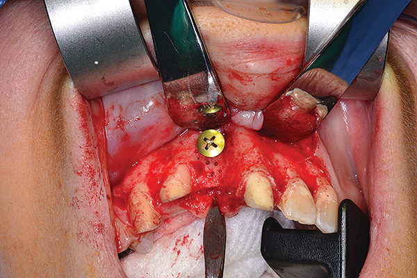 Figure 5 Ridge augmentation was completed with the use of a tenting screw (KLS Martin, www.klsmartin.com), recombinant human bone morphogenetic protein-2 (rhBMP-2) (Medtronic, www.medtronic.com), plasma rich in growth factors (PRGF) (BTI, www.bti-biotechnologyinstitute.com), collagen membrane, and a mixture of cortico-cancellous allograft and xenograft.