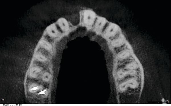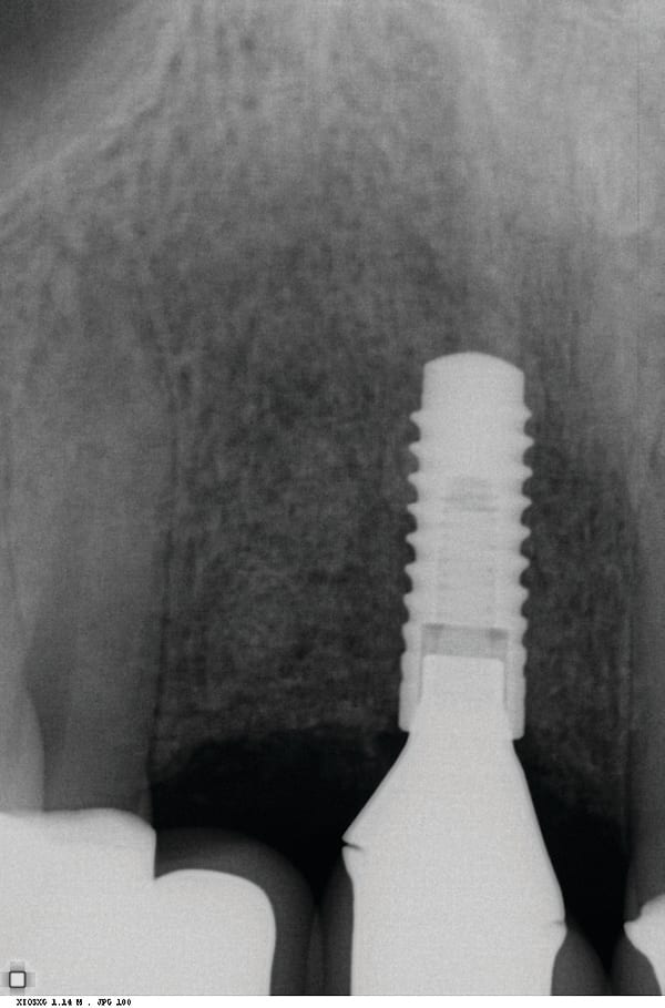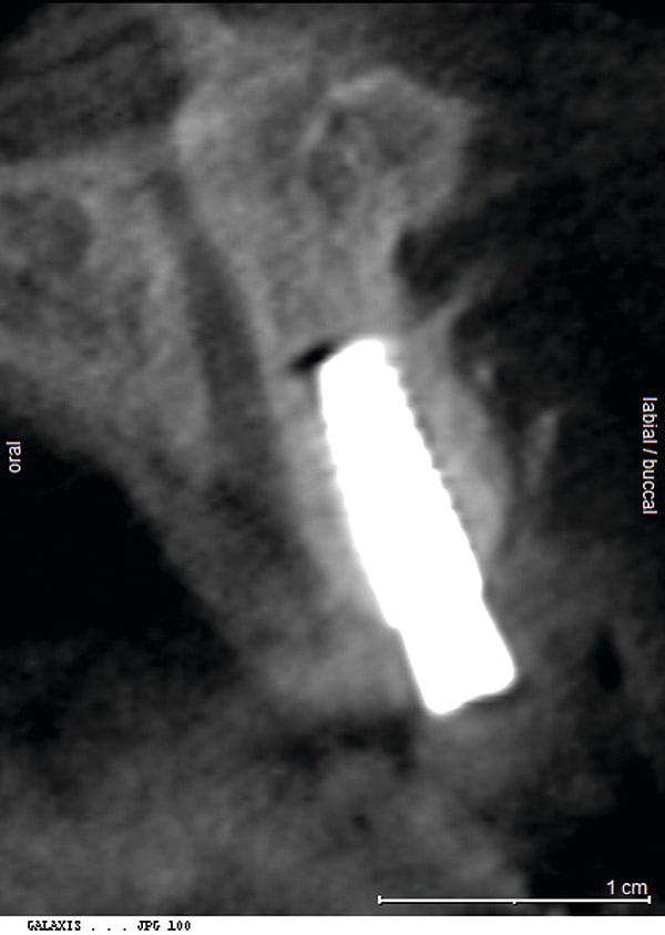 Figure 17 CBCT revealed 3-dimensionally sound implant placement No. 8; for optimum esthetic outcome, only a single implant for No. 8 was placed cantilevering pontic No. 7, avoiding central-lateral esthetic dilemma.