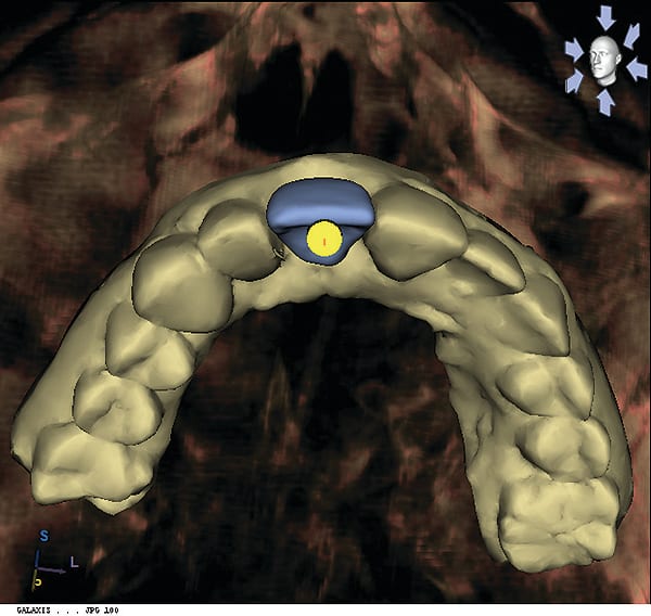 Figure 14 After obtaining 3-dimensionally sound implant position (3 mm from the free gingival margin and 2 mm palatal from the incisal edge), CBCT guided surgery (as shown) was performed (Classic Guide, Sirona Dental, Inc.).