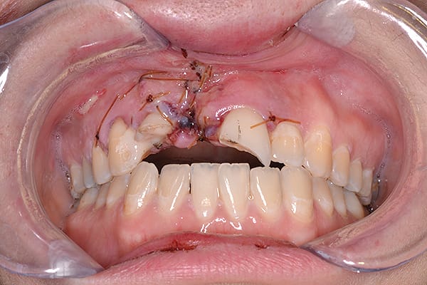 Figure 4 Retracted view, 3 months following the accident with temporization. Conservative initial surgical debridement was performed in order to avoid a collapse of both the alveolar ridge and soft tissue. There was no osteoclastic activity at this time. Intentional endodontic therapy was rendered on teeth Nos. 7 and 9.