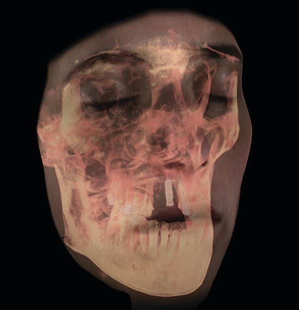 Figure 3 The patient sustained multiple complex maxillofacial injuries: orbital floor fracture; fractures of teeth Nos. 7 and 9; complete avulsion of tooth No. 8; complete labial plate dehiscence; significant loss of gingival architecture; and multiple contusions. GALILEOS CBCT (Sirona Dental, Inc.) was used in the diagnosis.