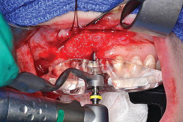 Figure 6 Ridge augmentation was completed with the use of a tenting screw (KLS Martin, www.klsmartin.com), recombinant human bone morphogenetic protein-2 (rhBMP-2) (Medtronic, www.medtronic.com), plasma rich in growth factors (PRGF) (BTI, www.bti-biotechnologyinstitute.com), collagen membrane, and a mixture of cortico-cancellous allograft and xenograft.